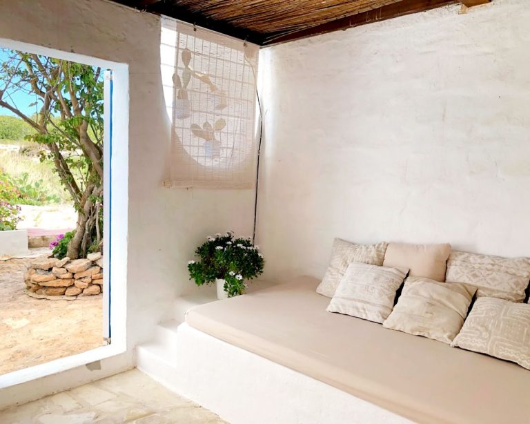 Alejada de los núcleos urbanos, la casa se sitúa en lo alto de una pequeña colina en Es Cap de Barbería y dispone, además, de dos amplias terrazas para poder descansar y admirar la paz del campo de Formentera y del cielo nocturno inundado de estrellas.
