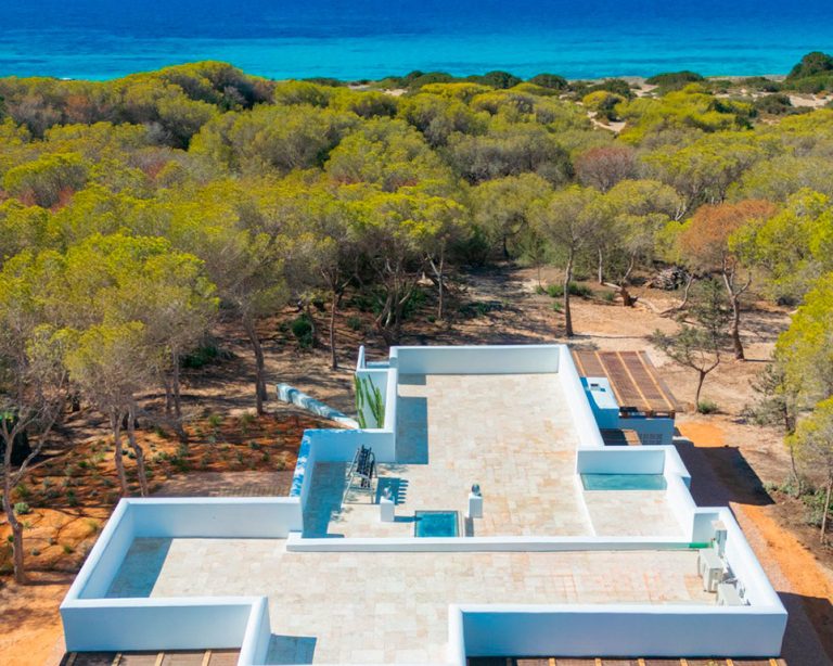 Casa Mediterráneo con capacidad para 10 personas, situada en la zona de Migjorn, con una terraza con vistas al mar.